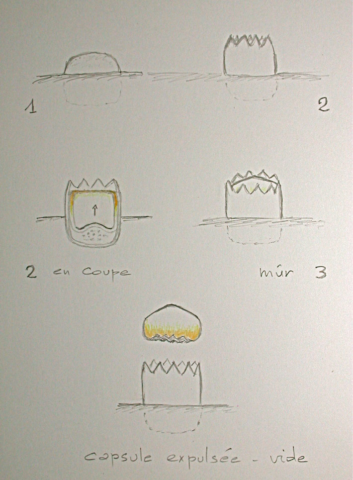 Les spores commencent sans doute à se développer au fond du calice, et le liquide par osmose passe entre les deux enveloppes, soulevant petit à petit la capsule qui en se retournant prend forme. Elle s'élève à former un dôme, les bords jaunes,