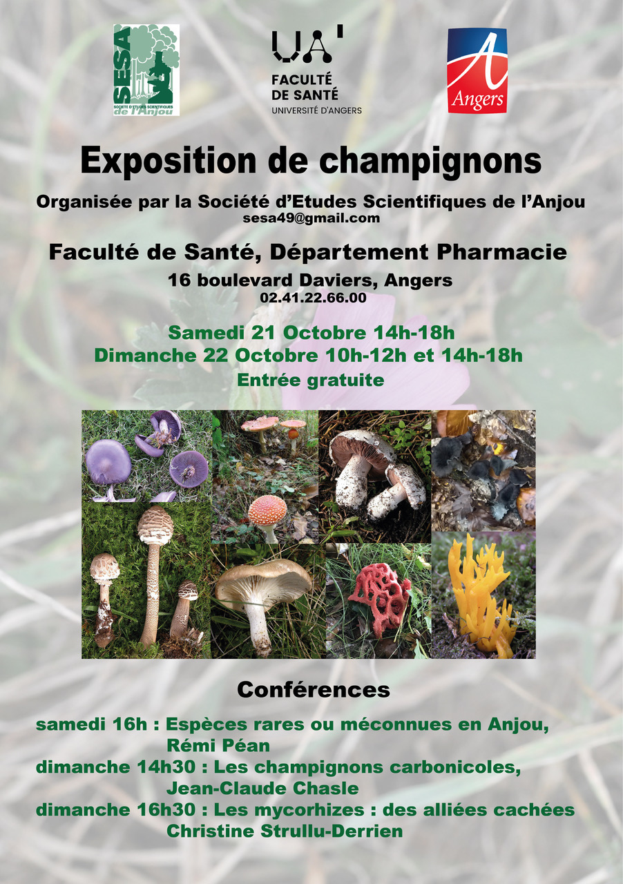 Bonjour, Le groupe mycologique de la Société d'Etudes Scientifiques de l'Anjou organise son exposition le week-end prochain ! Au plaisir de vous y rencontrer. Rémi