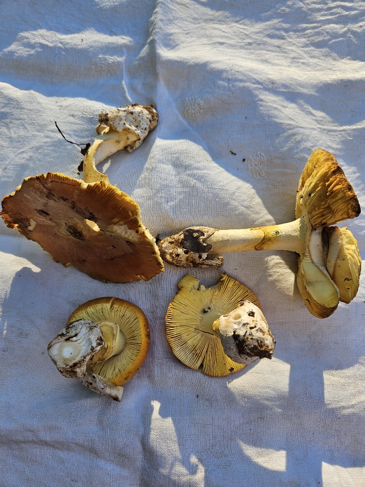 Sauf erreur, 4 amanita caesarea, trouvées à quelques mètres les unes des autres. Si ça ne se voit pas sur les photos, chaque champignon a ses lames jaunes et, toujours sauf erreur de ma part, les seules amanites à lames jaunes sont les oronges.