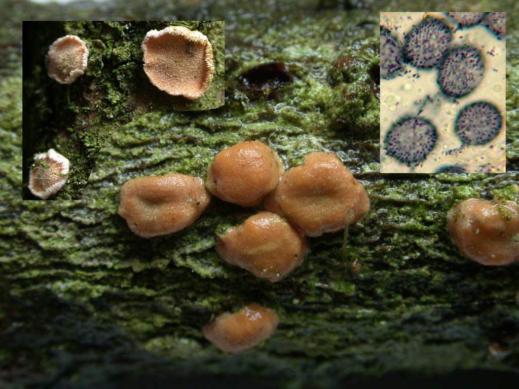 Aleurodiscus amorphus, jolie photo chez les Suisses n°45 tome 2. C'est un basidiomycéte, à allure d'asco, bombé imbu, en tartelette par le sec. Il a des spores rondes, épineuses, amyloïdes de la plus belle manière. Presque trop facile à déterminer...