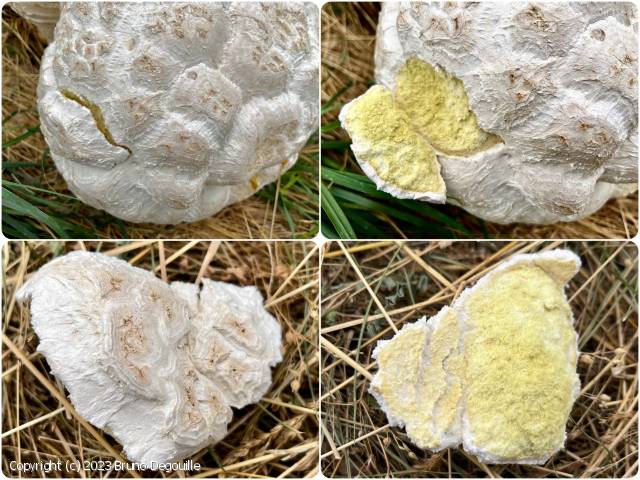 Calvatia gigantea (péridium lisse), Calvatia utriformis (taille moins importante, stipe bien présent)