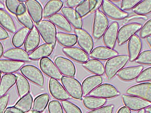 Spores ovales, asymétriques, un peu bossues vers la base, lisses, hyalines, quelquefois avec contenu granuleux, mesurant 7-12 × 5-7 µm, I-.